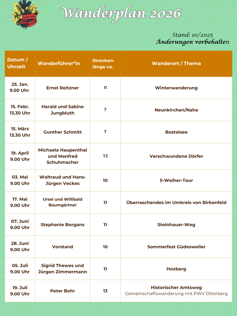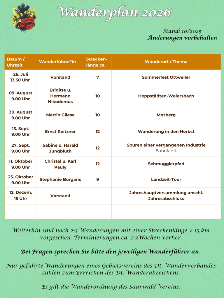 Nähere Details zu den angegebenen Wanderungen werden ca. 14 Tage vorher in der Presse (Saarbrücker Zeitung, Amtsblatt Nohfelden) sowie auf unserer Homepage veröffentlicht.